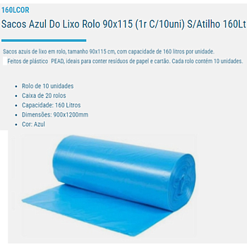 Sacos Azul Do Lixo Rolo 90X115 (1R C/10Uni) S/Atilho 160Lt